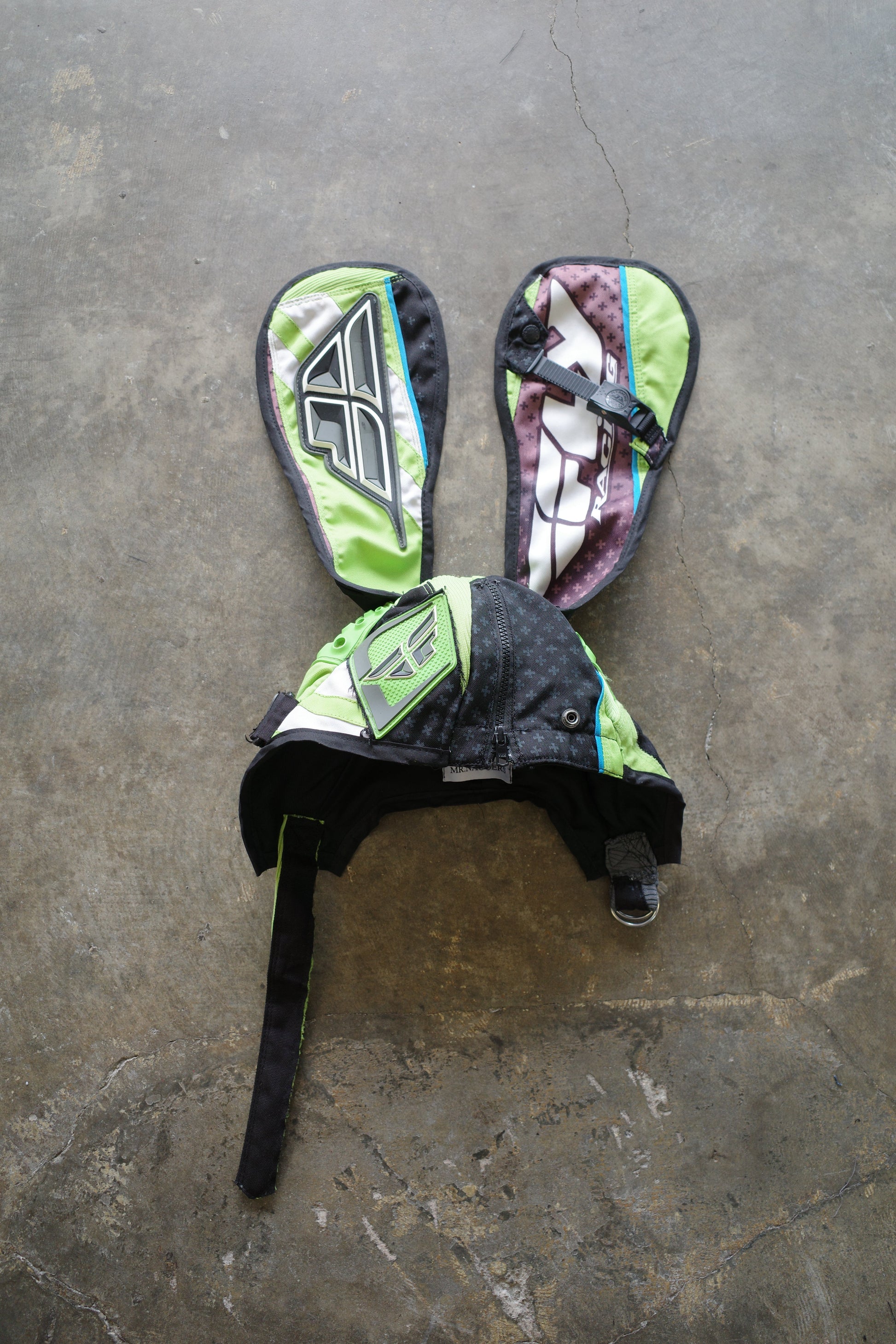 nag nag Bunny Ear Hat made with vintage FLY moto racing pants