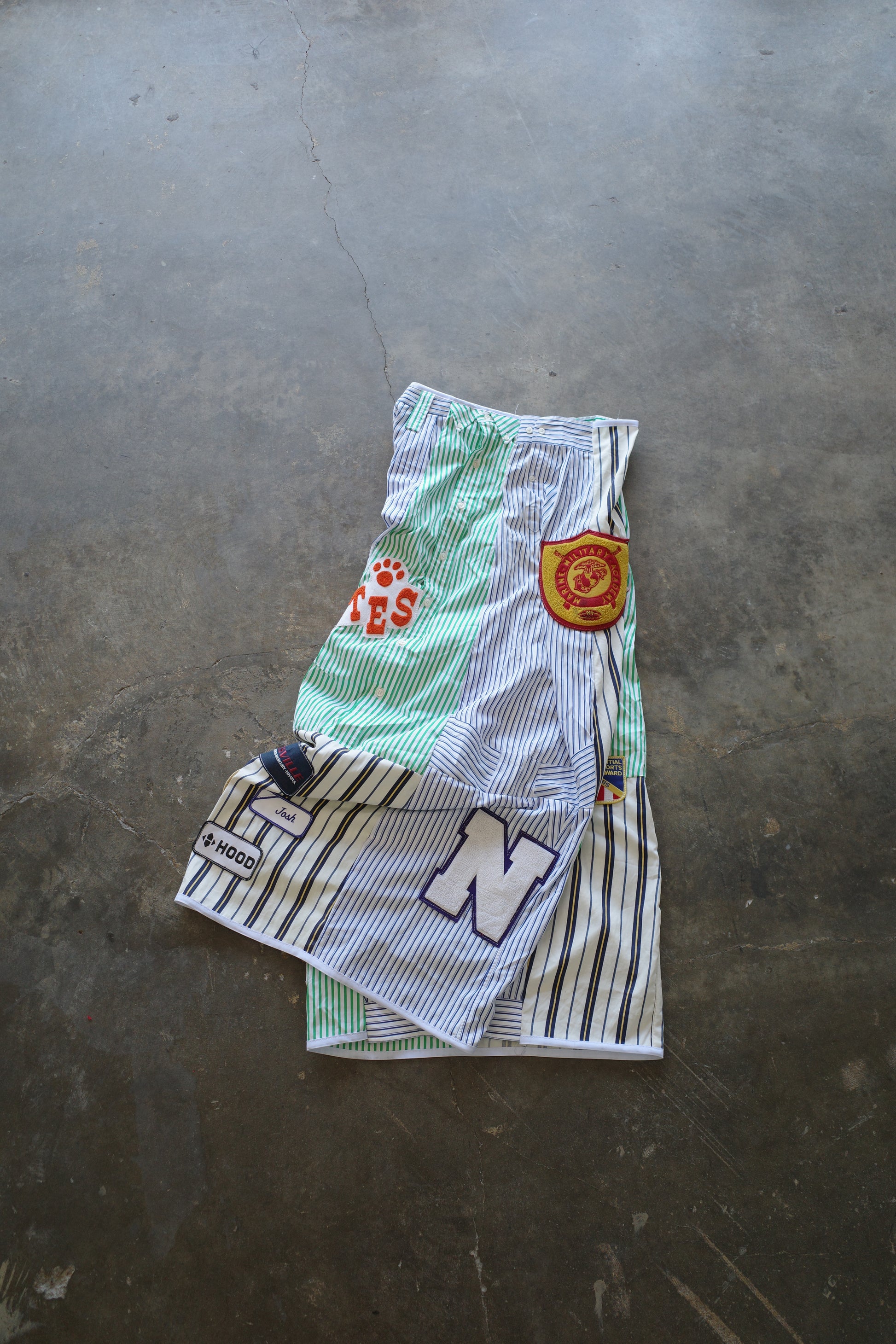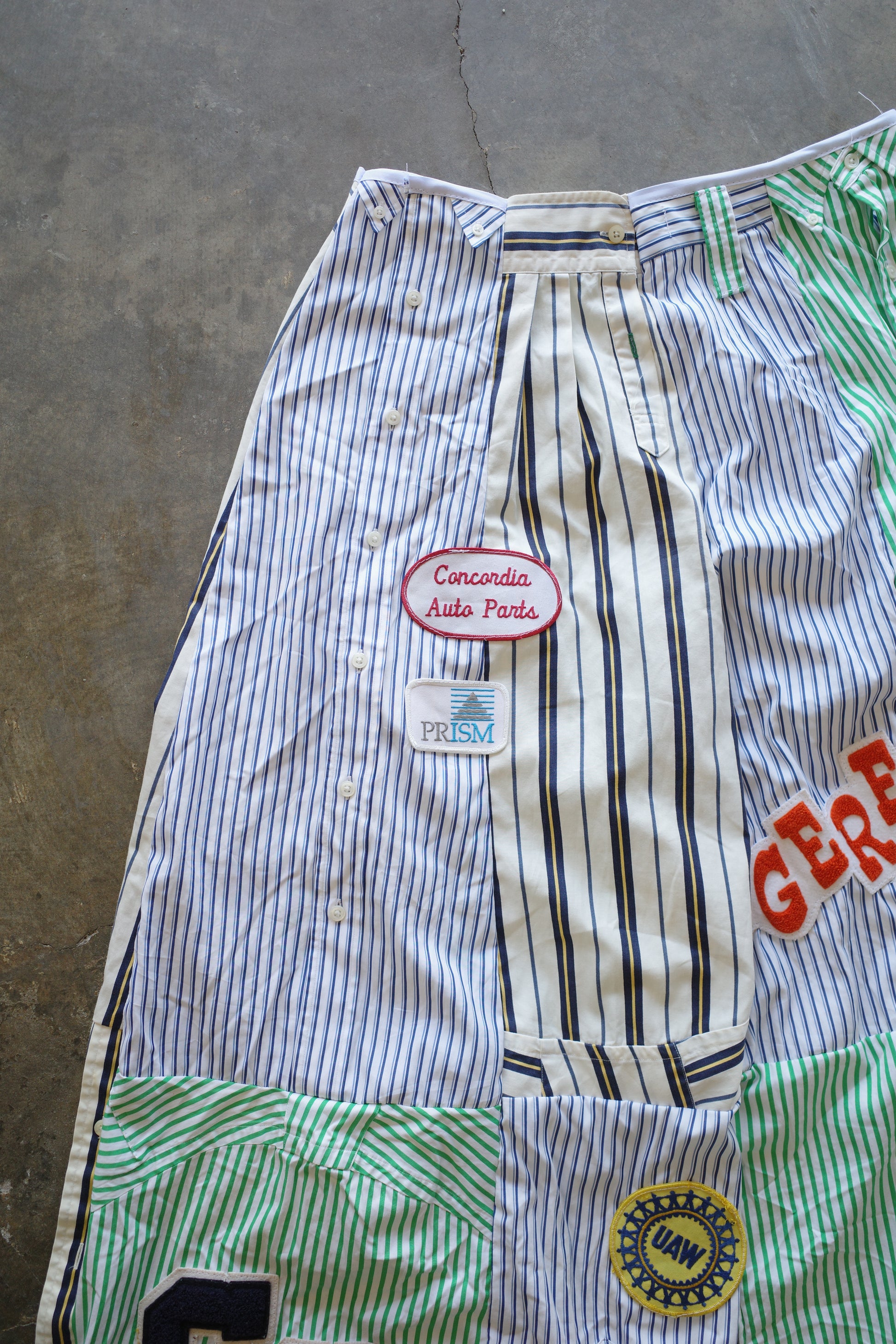 made with vintage mens striped shirt w vintage patches)))made by 3R