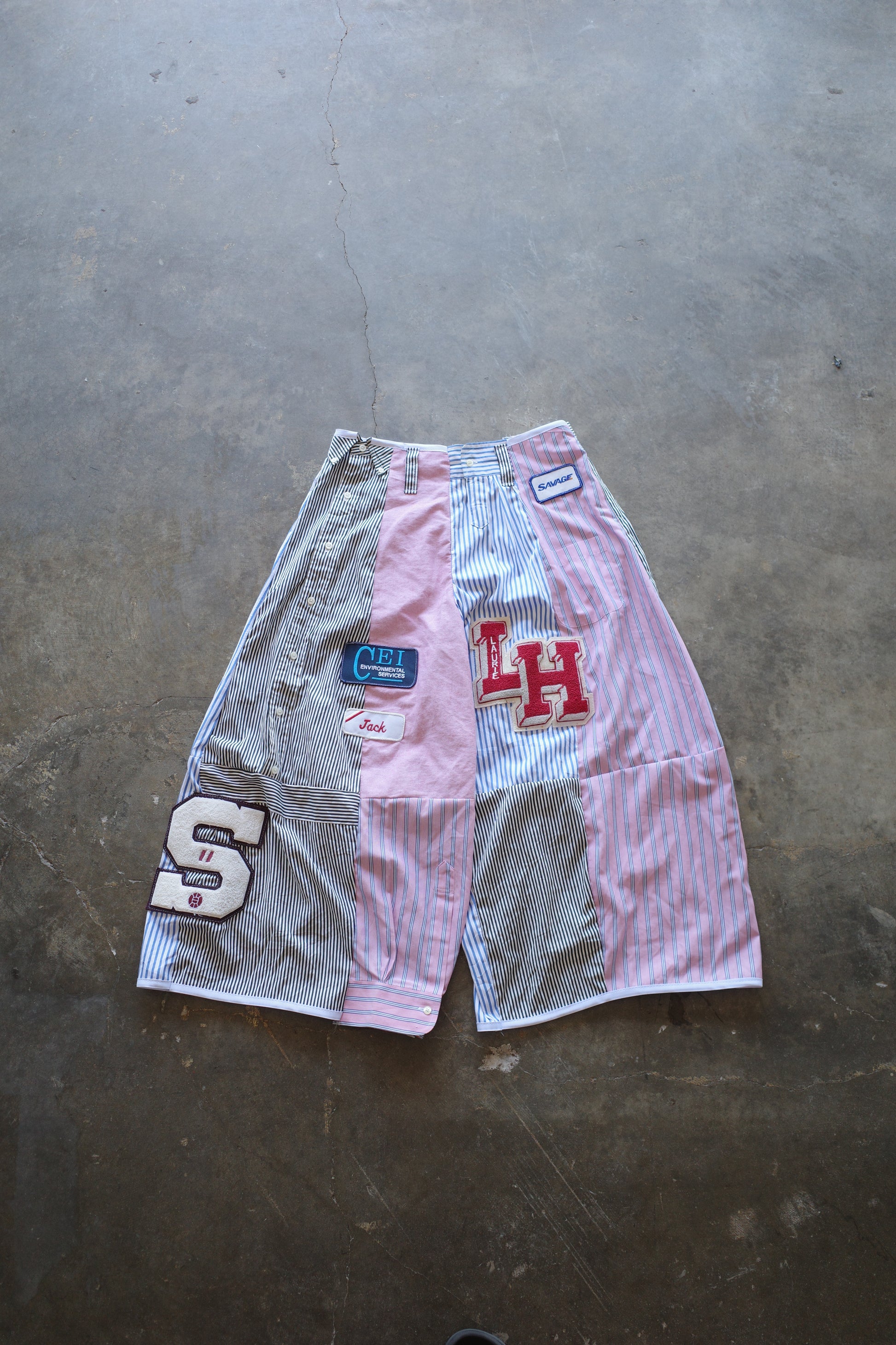 Wide Legged Patched Pants(S) / made with vintage mens striped shirt w vintage patches